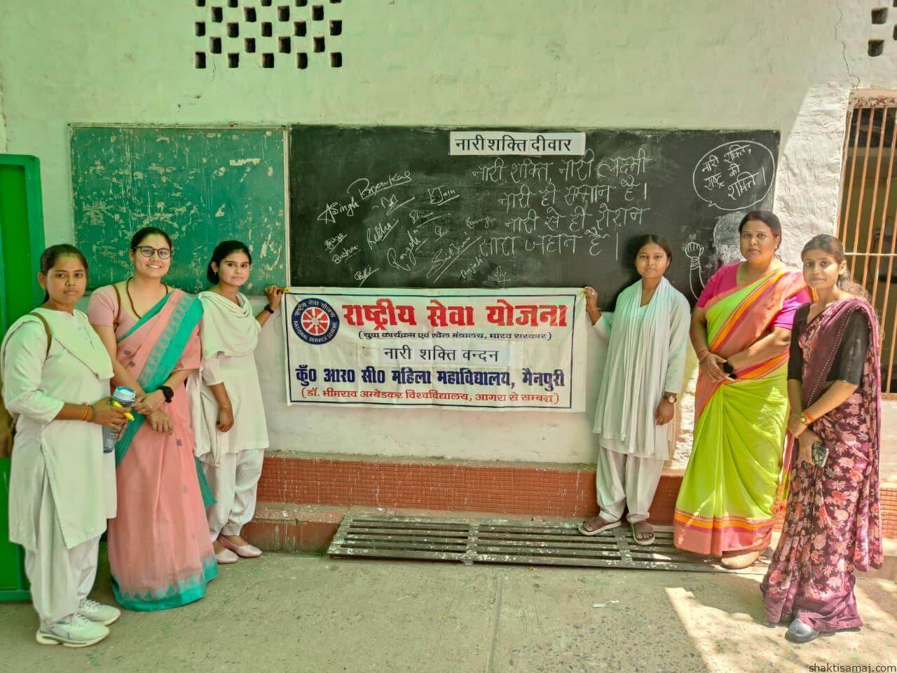 मैनपुरी। कुँ. आर. सी. महिला महाविद्यालय, मैनपुरी में राष्ट्रीय सेवा योजना (NSS) की संयुक्त इकाइयों के तत्वावधान में शासन के निर्देशानुसार “नारी शक्ति वंदन अधिनियम–2023” के प्रचार-प्रसार हेतु व्यापक कार्यक्रम आयोजित किया गया। कार्यक्रम के अंतर्गत “नारी शक्ति वंदन मानव श्रृंखला” एवं “नारी शक्ति दीवार हस्ताक्षर अभियान” का आयोजन किया गया, जिसमें महाविद्यालय के समस्त शिक्षक-शिक्षिकाओं, कर्मचारियों, विद्यार्थियों तथा NSS की स्वयंसेविका छात्राओं ने उत्साहपूर्वक सहभागिता की।